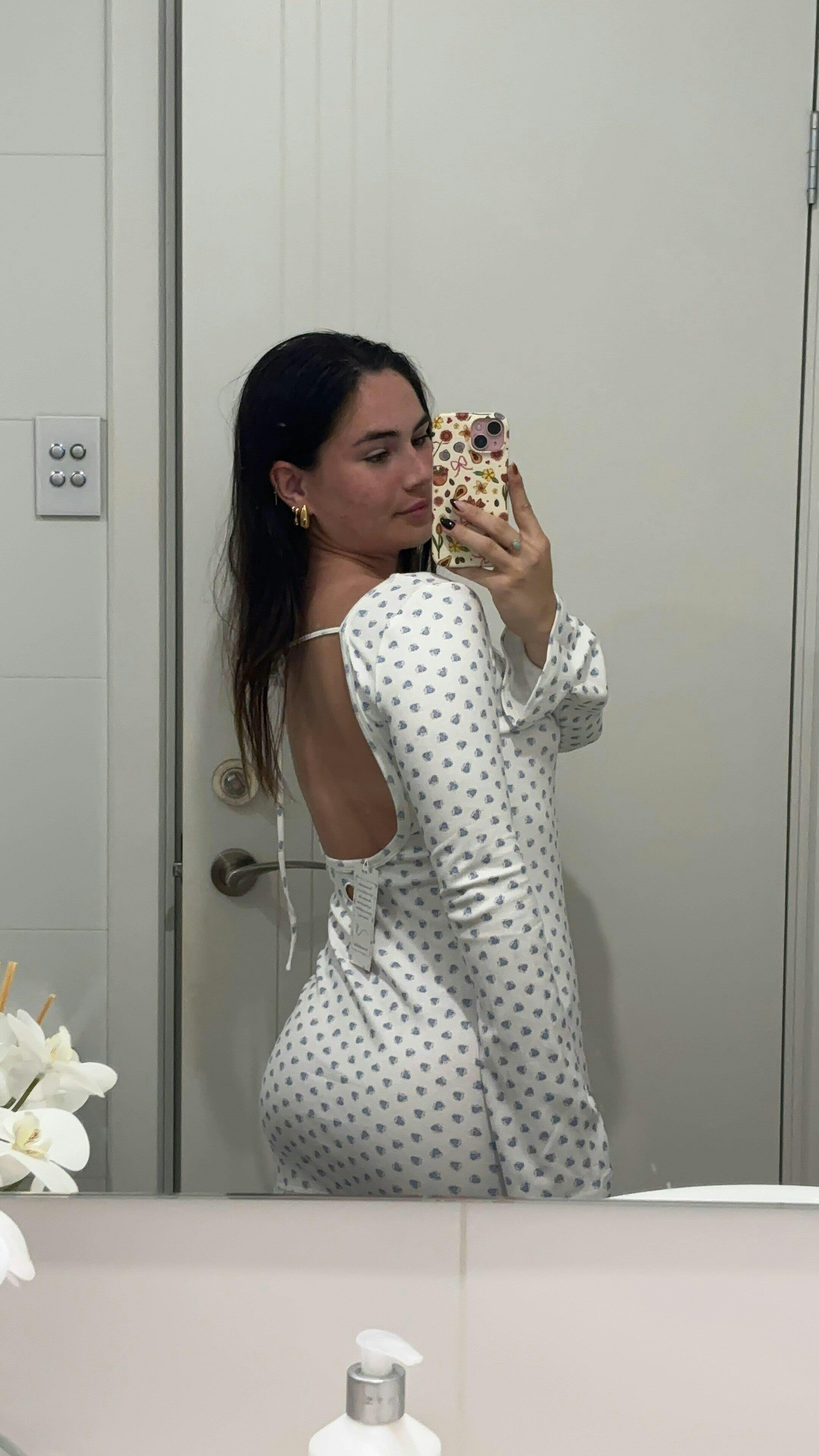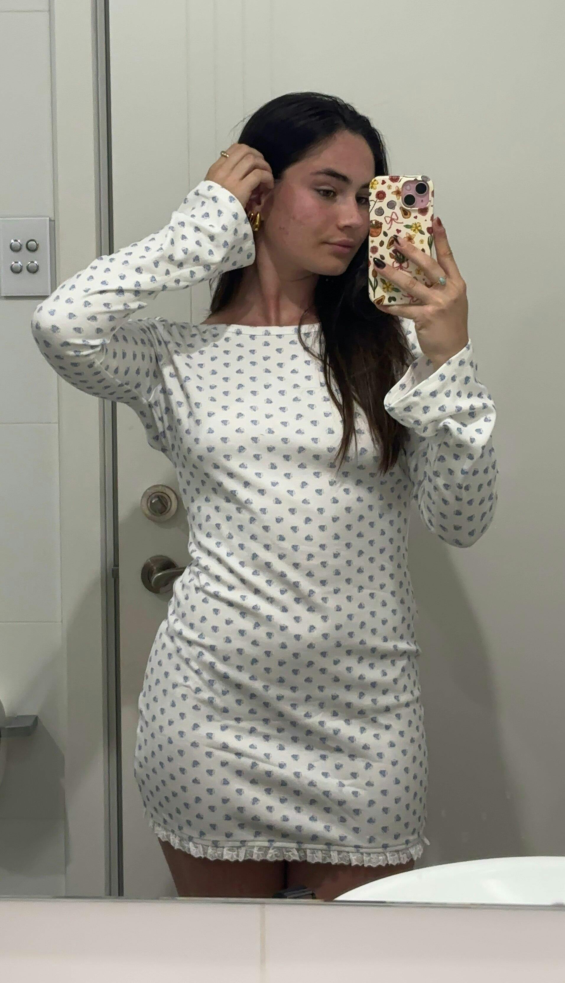 ♡ Meet the Liya Lounge Dress. A soft cotton dream, this backless long-sleeve dress is perfect for cozy mornings at the cottage or grabbing matcha with your girlfriends. Detailed with a delicate bow lace hem, our signature heart cutout on the back, and flowy flared sleeves, it’s finished in a periwinkle floral print for the sweetest touch.